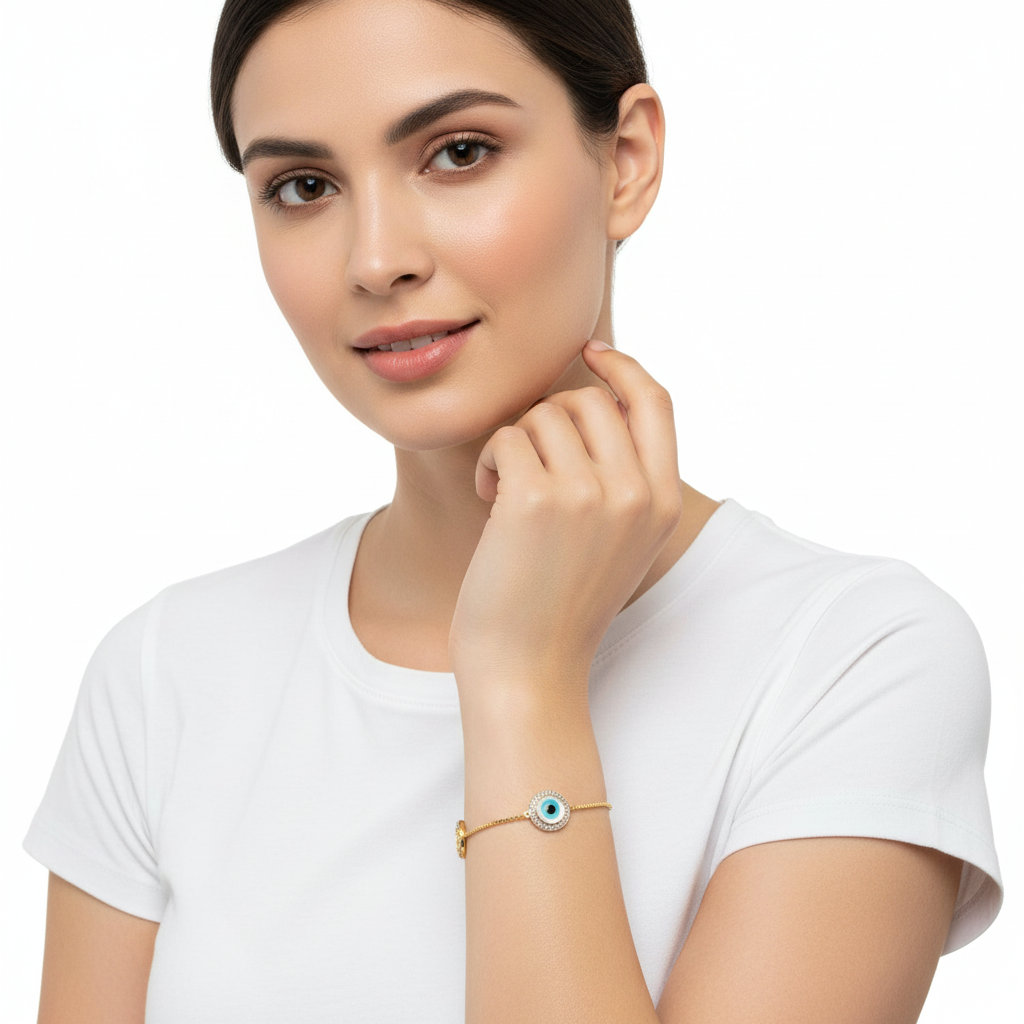 Evil eye, Om and sai gift bracelet set in hallmarked 14k gold studded with 78 round brilliant cut diamonds with 10mm charms.